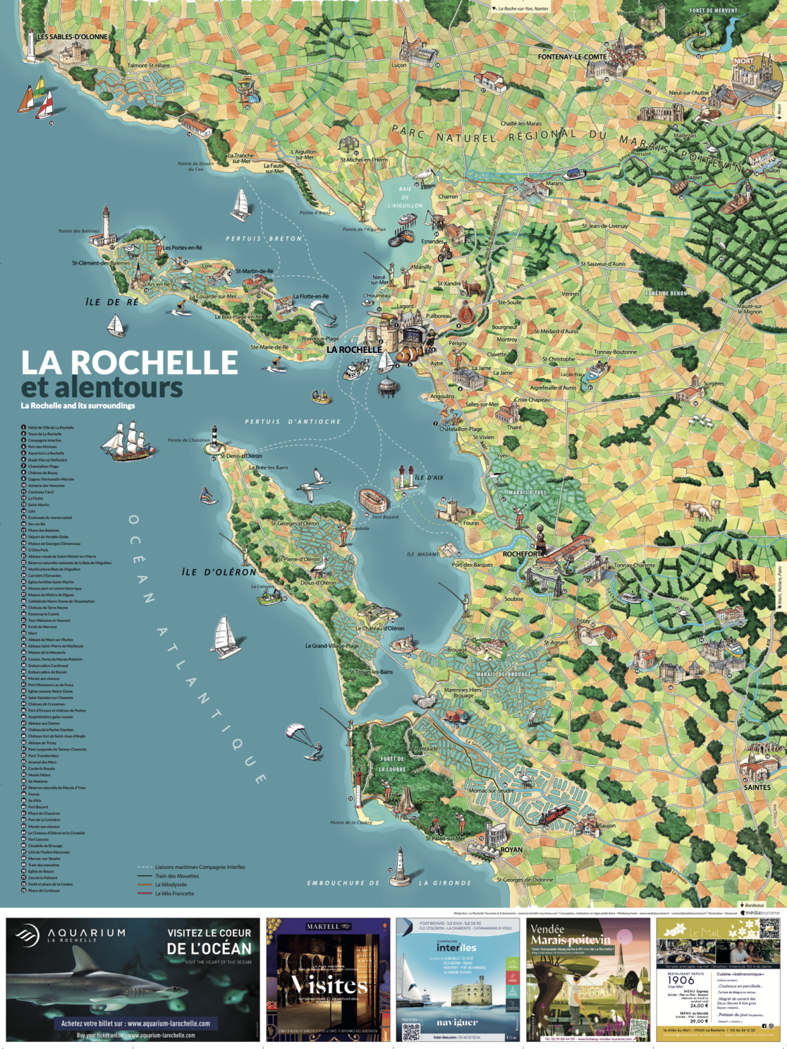 Après Bordeaux, La Champagne, le Bassin d’Arcachon, la Dordogne, Mediaregion, en collaboration avec l’Office de Tourisme de La Rochelle édite une carte de votre territoire illustré par Alain Glowczak : La Rochelle et ses alentours. La carte est présentée sous forme de poster. Au recto : une carte “vue du ciel” qui zoome sur les principaux centres d’intérêt et les grands acteurs du territoire . C’est une carte de situation. L’idée est simple : le visiteur peut embrasser le territoire d’un seul coup d’oeil et imaginer visites et activités très facilement. Au verso : quelques lignes explicatives traduites des 70 points d’intérêts choisis avec l’Office de Tourisme de La Rochelle. Le financement de cette carte est exclusivement privé. Les annonceurs bénéficient d’une visibilité supplémentaire sur la carte avec une illustration originale de leur établissement dessiné par Alain Glowczak.